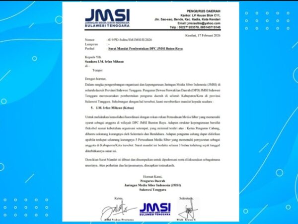 Baubau JMSI Sultra Mandatkan LM Irfan Mihzan Pimpin JMSI Buton Raya Buton Raya|18 Februari 2026oleh admin