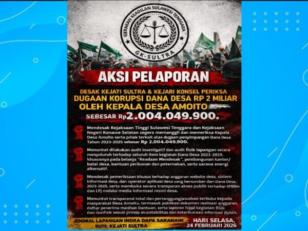 Konawe Selatan Kejari Konsel Tunggu Laporan Dugaan Korupsi Dana Desa Amoito Konawe Raya|20 Februari 202621 Februari 2026oleh admin