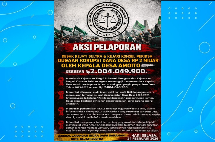Melalui pamflet yang tersebar luas, GK Sultra meminta Kejaksaan Tinggi (Kejati) Sultra dan Kejaksaan Negeri (Kejari) Konsel memeriksa Kepala Desa Amoito beserta pihak-pihak terkait. Mereka menengarai adanya dugaan korupsi dalam pengelolaan anggaran dana desa tahun 2023 hingga 2025 sebesar Rp2 miliar lebih.